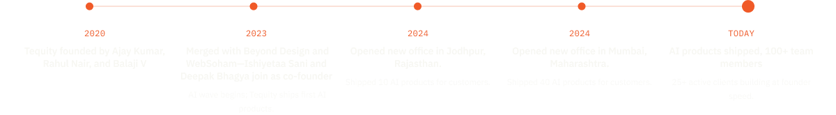 As Tequity grew, the team realized that to deliver truly excellent products, they needed world-class design and engineering capabilities under one roof. In 2023, Tequity merged with Beyond Design (founded by Ishiyetaa Sani) and WebSoham (founded by Deepak Bhagya), bringing together multidisciplinary expertise across product strategy, design, and engineering.